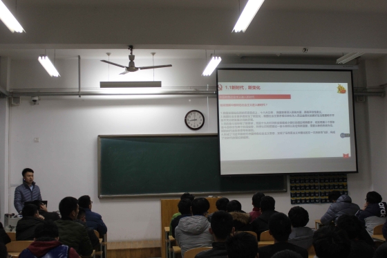 12月27日晚上7点,2014级学生党员姜涛同学在8教108为2017级入党积极分子讲解十九大精神微课堂。姜涛同学结合自己考研复习中学习党的有关理论知识的认识,讲解了我们新时代的新变化,和我们国家未来的发展方向,并指出我们当前和今后一个时期的首要政治任务是学习贯彻党的十九大精神,把十九大精神落实到实际学习生活中。同学们认真聆听并做好笔记,更加深入的学习到了党的十九大精神。