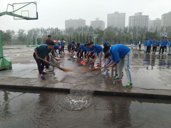 经过了连续几天的阴雨天气,新生训练场堆满了积水,为了能让新生继续训练,班主任助理带领着新生们到训练场打扫积水。新生们早早地到了规定的集合地点,根据班主任的安排有序的进行着清扫活动,同学们用手中的工具打扫着训练场地,把训练场上的积水一点点的清理出去。没过多久,整个训练场就焕然一新,随后,清扫活动也接近尾声。