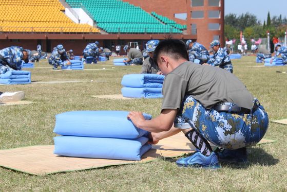 本次比赛要求参赛选手须在规定时间五分钟内叠完军被,后由教官代表进行打分。随着主持人“3、2、1!开始!”的号令,同学们纷纷开始叠军被。每个人的动作都十分利落而娴熟。选手们很认真,争分夺秒,仔细得叠好每一步,铺展开被子并用力压实,仔仔细细抹平褶皱,后用指尖卡角,捋直军被边缘,用手掌切出缝隙,将被子两面翻叠,并对整体的被子形状进行修整,认认真真地捏出被子的棱角。细致入微的动作,严肃认真的面容,体现出了我院新生细心认真、务实肯干的精神品质。随着裁判的哨声,同学们立刻放下手中军被,立正站好,并在教官的指挥下有序撤离。随后教官评委逐个对现场的选手叠军被的作品进行打分。至此,本次比赛圆满结束。