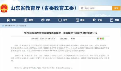 7月5日,山东省教育厅发布了《2020年度山东省高等学校优秀学生、优秀学生干部和先进班集体公示》,全省共有3856名同学入选2020年度高等学校省级优秀学生、1953名同学入选2020年度高等学校省级优秀学生干部、896个班级入选2020年度高等学校省级先进班集体。