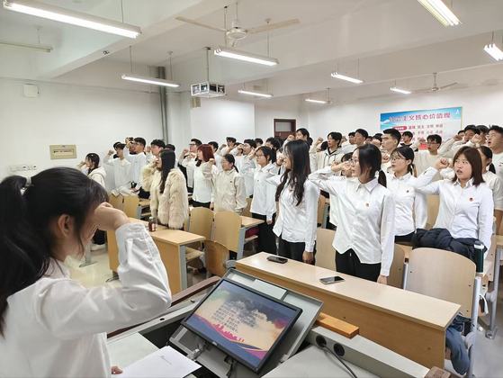 在老团员为新团员佩戴团徽的仪式后,全体成员在团支部宣传委员展翼飞的带领下重温入团誓词,铿锵的誓言彰显了青年一代的理想信念。