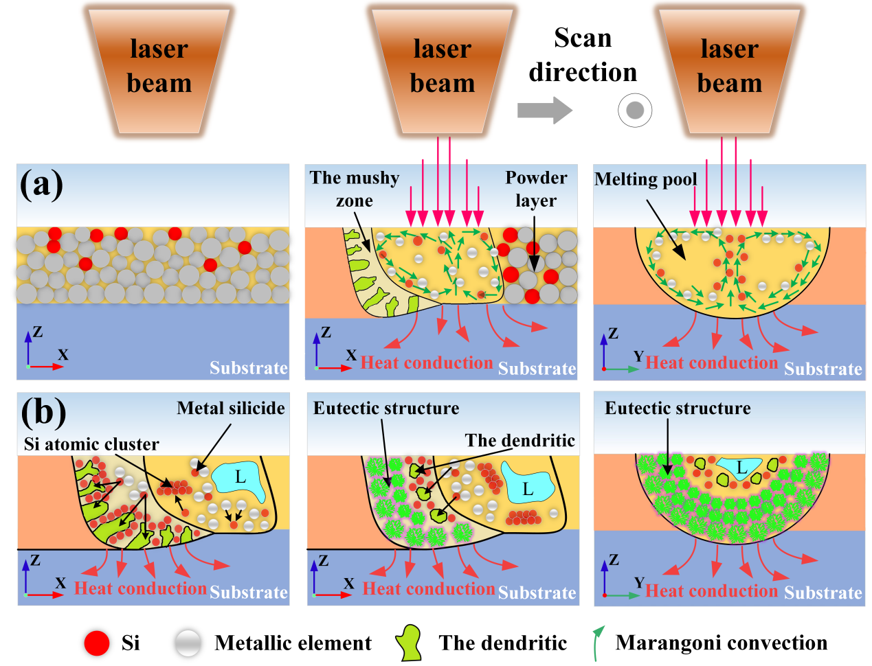 Si元素作为典型的类金属元素,其可能通过改变合金相组成、调控氧化膜生长动力学或引入特殊界面结构等方式,对合金的耐蚀性能产生独特影响。本研究采用激光熔覆技术在SUS304不锈钢表面制备了FeCoCrNiMoCu0.8Six (x=0.2,0.3和0.4)共晶高熵合金(EHEA)涂层,研究了Si含量对微观组织演变和耐腐蚀性能的影响。研究发现,随着Si含量的增加,富Cu相由连续偏析带转变为离散分布,共晶团簇单元尺寸减小,降低了微区成分的不均匀性。电化学腐蚀结果揭示,Si0.4合金表现出最优的腐蚀抗力,其腐蚀电流密度最低,钝化区间跨度最大。此外,Si0.4合金表面的钝化膜厚度最大(d=8.1nm),主要由高价态氧化物和氢氧化物组成,能有效阻碍腐蚀离子的渗透。钝化膜中的Si优先氧化形成SiO2,推动了体系向Si/SiO2平衡态转变,间接促进了Cr2O3的富集。SiO2与Cr2O3构成的复合氧化层,能够显著增强钝化膜的稳定性和自修复能力。 Fig. 1 Schematic illustration of microstructural evolution of FeCoCrNiMoCu0.8Six coating: (a) melting process; (b) solidification stage. 该研究得到了国家自然科学基金(Grant No. 52205181)、山东省高等学校“青创团队”计划项目(Grant No. 2022KJ089)和山东航空学院研究生创新基金(Grant No. SHSYCX18)的资助 《Applied Surface Science》是Elsevier旗下的著名期刊,专注于发表表面科学及其应用领域的原创性研究成果。该刊主要发表材料科学、物理学等多个学科的重要学术平台。2025年影响因子达到6.9,为中科院SCI二区期刊。 原文链接:https://www.sciencedirect.com/science/article/abs/pii/S0169433225027795