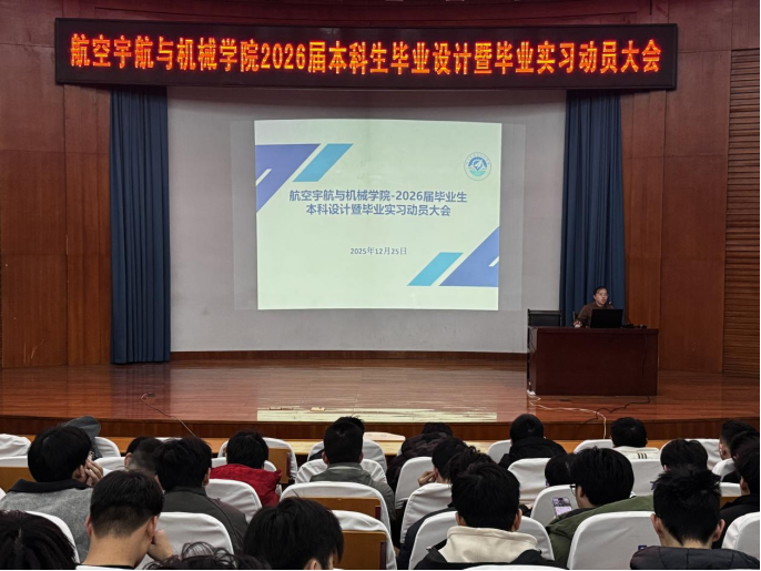 为切实做好2026届本科生毕业设计与毕业实习统筹推进工作,明确各阶段任务要求,凝聚师生奋进共识,12月25日,航空宇航与机械学院在明德报告厅隆重召开2026届本科生毕业设计暨毕业实习动员大会。学院副院长、各教研室主任、全体毕业设计与毕业实习指导教师,以及2026届全体毕业生参加会议,会议由毕业年级辅导员颜茹主持。