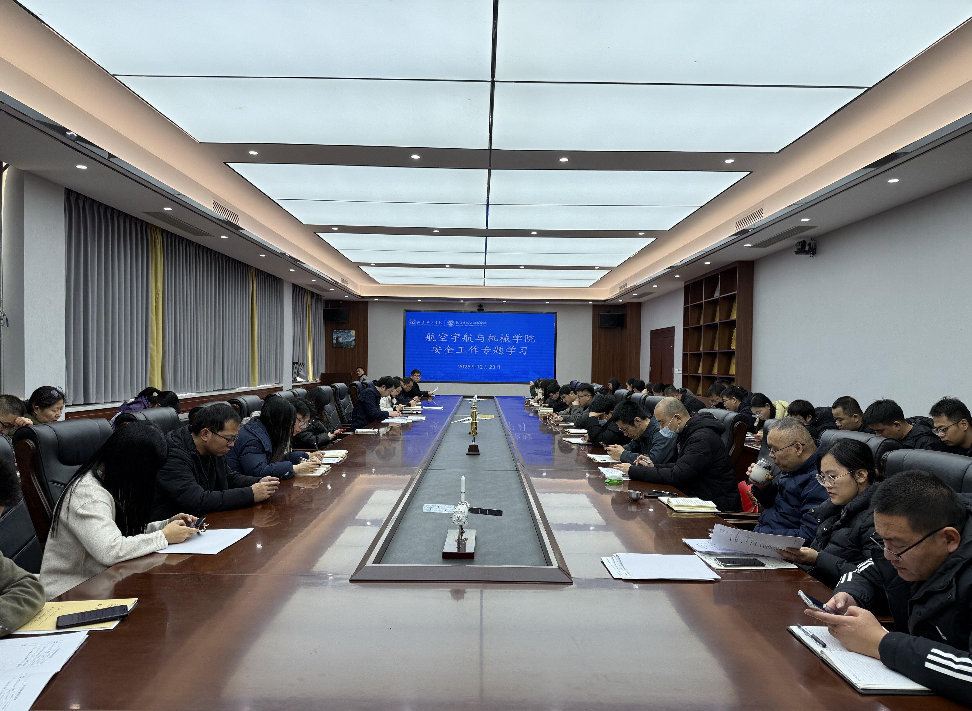 12月23日,航空宇航与机械学院在学院会议室召开全体教职工会议,专题传达学习学校近期发布的实验室安全管理及火灾风险隐患排查系列文件,部署学院安全专项工作。全体教职工参加会议。