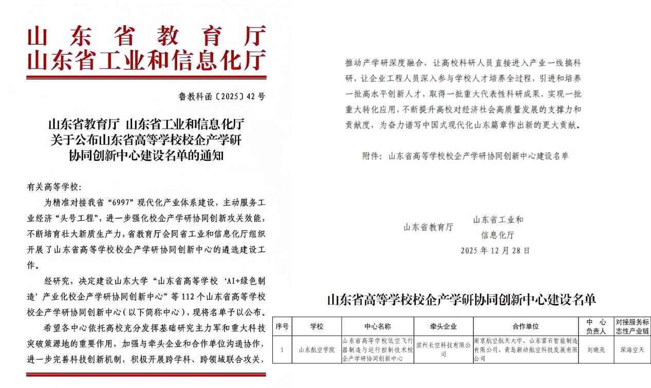 近日,山东省教育厅与山东省工业和信息化厅联合发布了《关于公布山东省高等学校校企产学研协同创新中心建设名单的通知》(鲁教科函〔2025〕42号),我院牵头申报的“山东省高等学校低空飞行器制造与运行控制技术校企产学研协同创新中心”成功获批,标志着我院在服务区域产业发展、推动产学研深度融合方面迈出坚实一步。