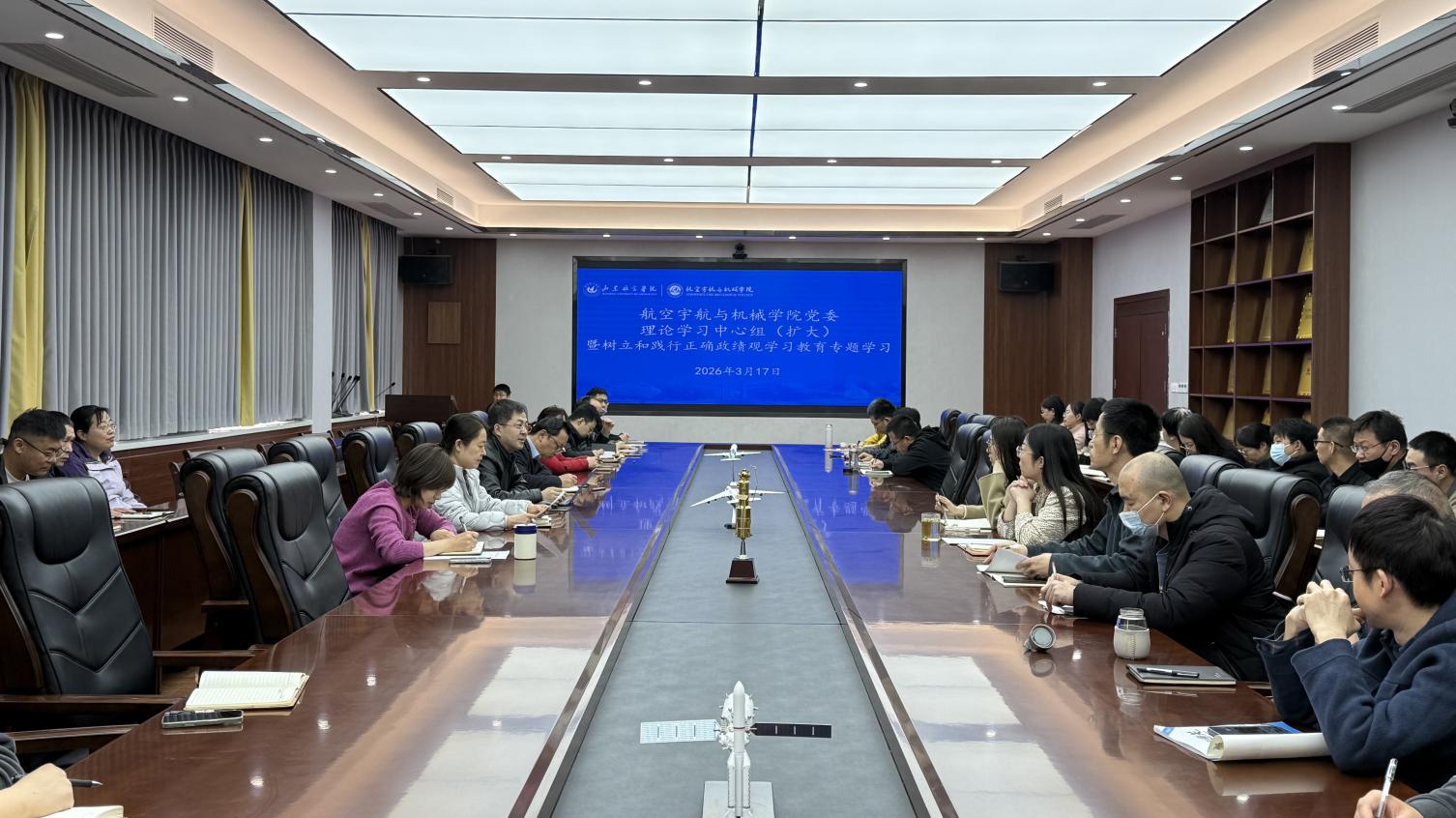 3月17日下午,航空宇航与机械学院党委理论学习中心组(扩大)在学院会议室召开专题学习会,围绕树立和践行正确政绩观开展学习研讨。学院全体教职工参加学习。